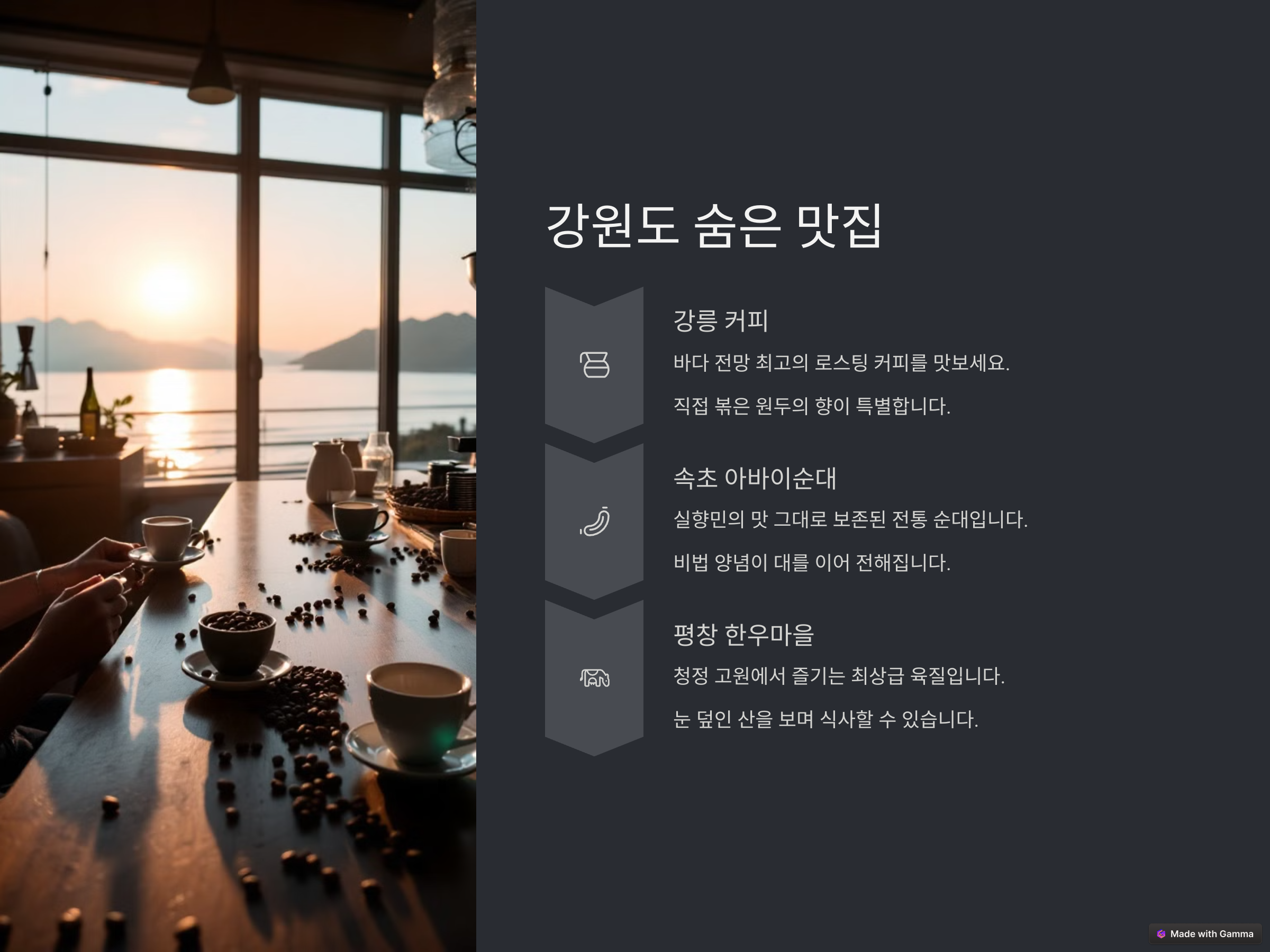 강릉에서는 바닷가 근처의 한 해산물 식당을 소개합니다. 메뉴는 단순했지만 신선한 재료와 주인장의 정성이 그대로 느껴지는 음식이 인상 깊었습니다. 특히 성게알 비빔밥은 고소하면서도 바다 향이 가득했고, 미역국 한 그릇에도 깊은 풍미가 담겨 있었죠. 여유로운 분위기 속에서 바다를 바라보며 식사하는 그 순간은 정말 힐링 그 자체였습니다.